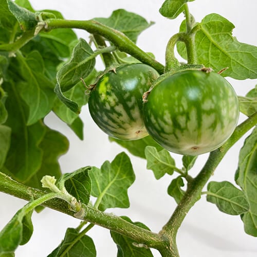 The adorable, small, and round fruit have glossy, green-and-white skin and reach about 1 to 2 inches in size following a purple, star-shaped flower. When eaten raw, the fruit are crunchy with a mild, bitter-herbaceous flavor. When cooked, the fruit soften and lose their bitterness. Stems and leaves can sometimes grow small thorns, so use care (or thicker gloves) when handling your plant.