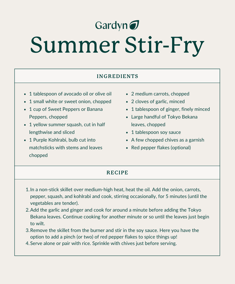 This stir-fry highlights the beauty of Gardyning the rainbow and comes together in minutes. Swap out the summer squash for Mini Eggplant or Bok Choy for the Toyko Bekana (or experiment with your own Gardyn-inspired combinations).