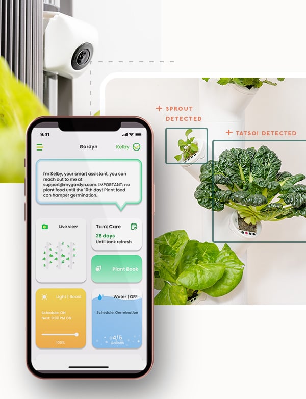 Kelby via the Gardyn app monitors your plants 24/7 and vacation mode even takes care of them while you’re away.