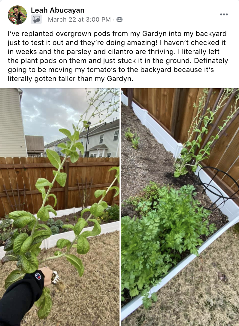 Did you know your Gardyn can be used as a clever tool to prepare plants for an outdoor garden? Gardyner Leah shared this side-by-side photo in our popular Gardyner Group on Facebook of her transplanted cilantro and parsley.