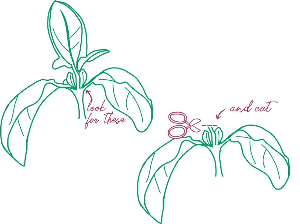 🌿 Harvest: Harvesting frequently helps prolong the plant’s life. Pinch off individual leaves, or use clean shears to cut stems above growth nodes. Find growth nodes just above the two largest leaves on a stem. You should see another, small set of leaves or knobs (nodes) growing between the stem and larger set of leaves. Cut the stem 1/4-1/2″ above the nodes and watch the small leaves grow large!