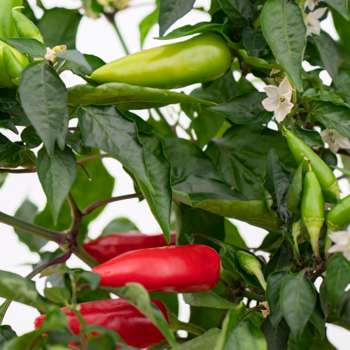 This compact pepper won’t take up much space on your Gardyn and yields mildly hot peppers that are less spicy than a jalapeno. Burrito Peppers measure about 3,000-6,000 SHU (Scoville Heat Units) on the Scoville Scale. This easy-to-grow variety produces 4-inch, conical fruits that ripen from a lime green to bright red color.