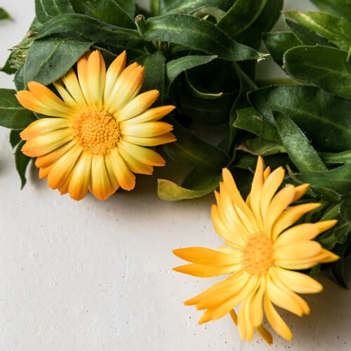 Fiesta Gitana is a dwarf type of calendula flower, only growing up to 14 inches tall at most. The quick-blooming, semi-double flowers range in color from deep orange to bright yellow and pastel cream. Not only are the flowers beautiful, but also edible, with a tangy-bitter peppery flavor and anti-inflammatory, antiseptic, and antibacterial properties. The leaves have a bright, somewhat astringent scent.