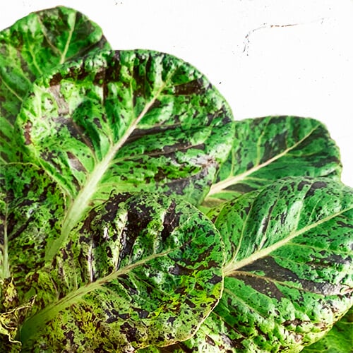 Flashy Trout Back lettuce has red spots on its leaves that look like the back of a trout. This speckling is normal! It has incredibly tender and mild, sweet leaves and is comparable to romaine and butter lettuce.